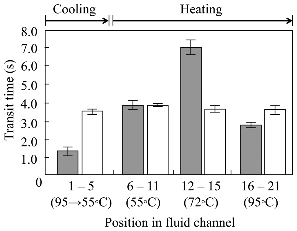 Next, the transit time in each temperature zone was investigated and compared to continuous flow (Figure 5). The transit time was longest between measuring points 11–15. An increased extension zone is very beneficial for PCR amplification. In contrast, the transit time was the shortest between measuring points 1–5. These results indicate that the heating time in the extension zone was longer than anticipated, but the cooling time from denaturation to annealing was shorter. The time ratio typically recommended for PCR amplification is 2:3:1 for annealing:extension:denaturation. In general, the cooling process from denaturation to annealing in flow-through PCR requires moving the fluid as quickly as possible. This is because the denatured single-stranded DNA is very likely to form double-stranded bonds with the template strand or the complementary fragments in this process, resulting in the reduction of DNA amplification efficiency.