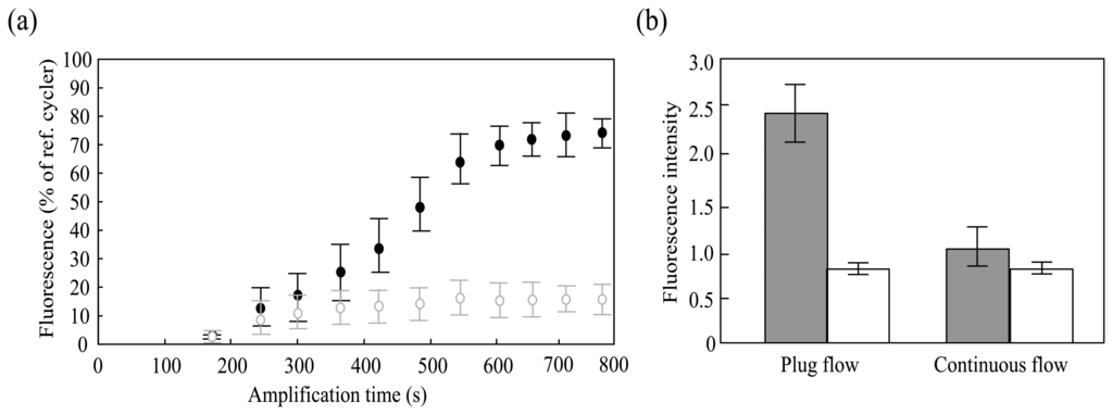 Yields of PCR amplification compared to those with thermal cyclers were investigated against cycling time (Figure 6a). The values were normalized to the fluorescence of the product from the standard thermal cycler as a reference and plotted against the total cycling time. Significantly, a flow time of 600 s showed a fluorescence of 67% compared to the conventional thermal cycler (commercial PCR equipment), while that of the negative control not containing target genes was less than 10%. The amplified product was also detected with sufficient sensitivity. Fluorescence increased as a sigmoidal function, which is a typical curve for PCR amplification. Overall, the fluorescence intensity obtained with the plug-flow chip was lower than that observed with the conventional thermal cycler. Because the long micro-channel allows for adsorption of PCR components to the surface of the chip due to the large surface area-to-volume ratio of the plug, there is a risk of a decrease in the amplification efficiency with micro-channel-based systems compared to conventional thermal cyclers.