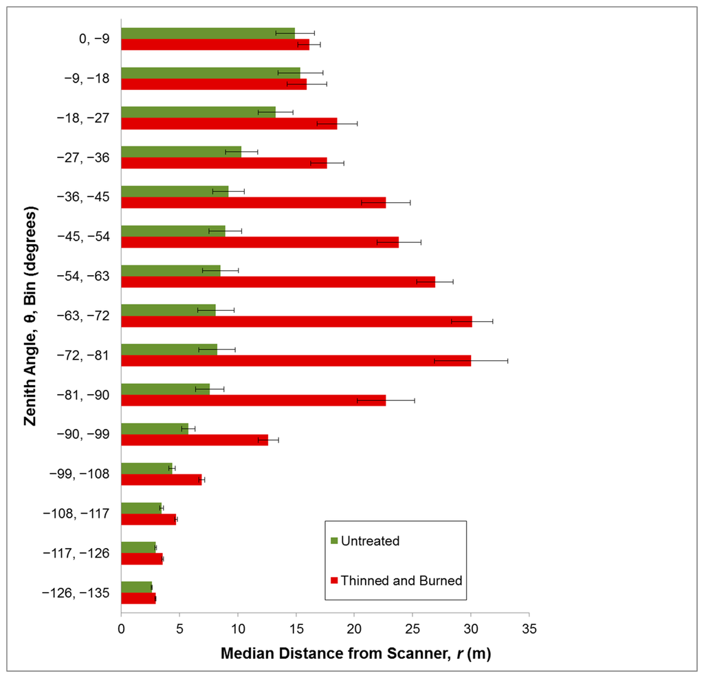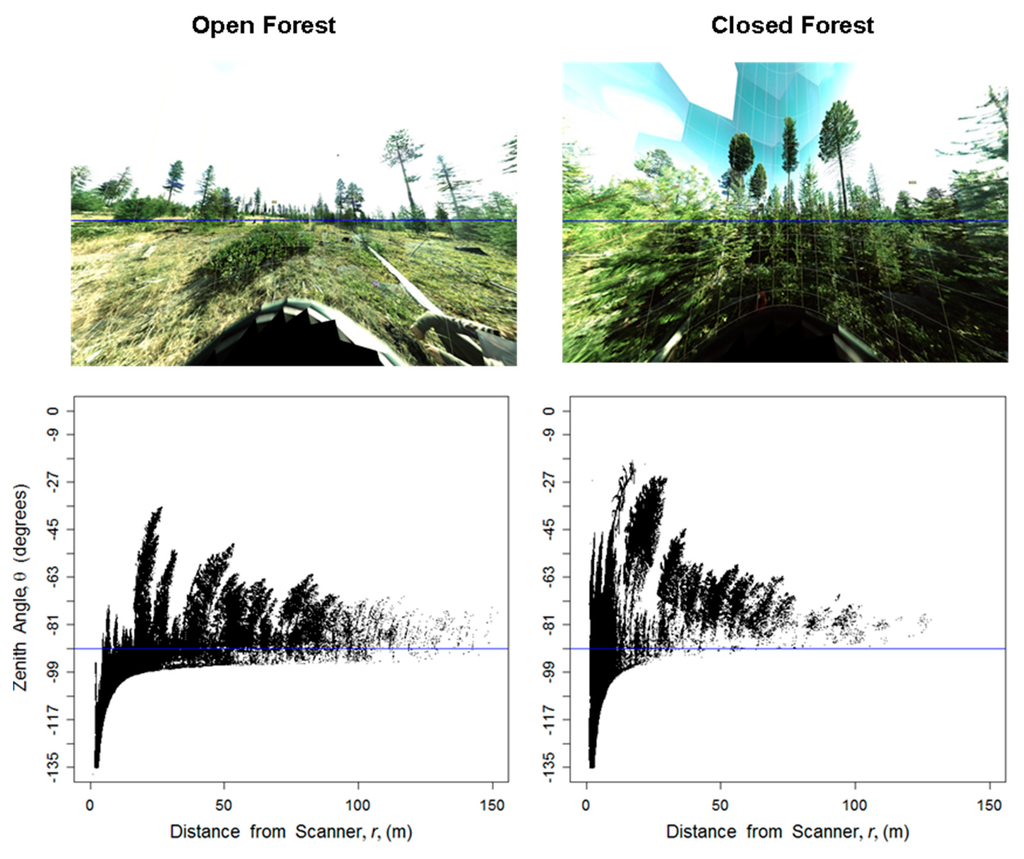 One significant research need is how these indices, and TLS based methods in general, can be applied in areas with highly sloped terrain. On a slope, the TLS instrument cannot sample equally in all directions of ϕ. On the uphill side, more laser beams will reflect off the ground, while the opposite is true on the downhill side. Without correction, this can affect both indices, as point density will be higher on the uphill side regardless of the vegetation present. In this study, the plot locations were all located on relatively flat topography, but the effects of slope can still be seen. The open forest in Figure 1 provides an example of non-flat terrain; the photomosaic shows ground sloping slightly uphill to the left and downhill to the right. The pattern is also reflected in the plots of r and θ, where distinct “ground lines” can be seen. Slopes should be avoided while using these methods, unless modifications and corrections are developed. For example, it is possible to angle the scanner to match the slope as is sometimes performed with hemispherical photography [29] or to construct a digital elevation model from the raw points and adjust the indices in post-processing. Constraining the area sampled to only short distances away from the scanner may limit the effect of slope.