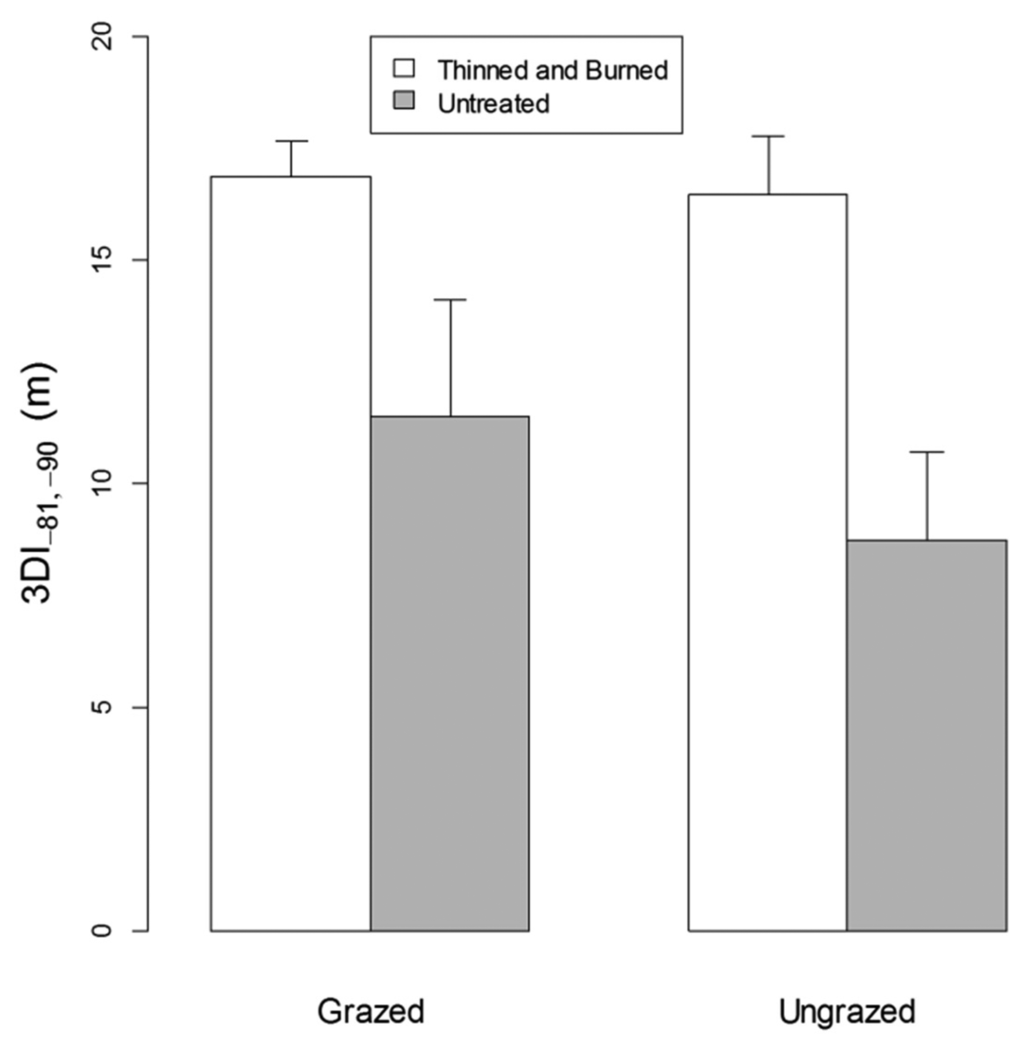 For all angle bins, vegetation density as measured by 3DI was greater in thinned and burned than untreated plots (Figure 3). At the smallest zenith angle (closest to ground) the difference is small because of the relatively short distance the laser travels before it reflects off the ground. We concentrated on 3DI within a θ angle range between −81° and −90° as this range allowed a large swath of vegetation to be sampled while including a minimum of ground points, as the perspective is close to horizontal in all directions. A two-factor split-plot ANOVA (Table 1; Figure 4) indicated that 3DI differed significantly between forest treatments (p < 0.01) but not between grazing treatments (p = 0.54). The forest treatment × grazing interaction was also not significant (p = 0.64).