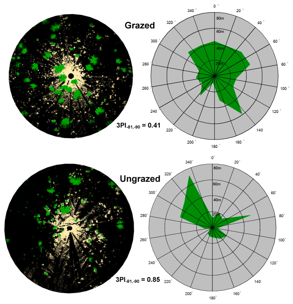 We used the same θ increment to assess vegetation patchiness around the scanner. Figure 5 displays a visualization of patchiness for representative grazed and ungrazed plots that were thinned and burned. Median values of r are plotted for each of the 15 bins of ϕ, and 3PI values are given. A two-factor split-plot ANOVA (Table 2; Figure 6) indicated that 3PI did not differ between forest treatments (p = 0.86) but tended to differ (p = 0.07) between grazed and ungrazed treatments. The forest treatment × grazing interaction was not significant (p = 0.94).