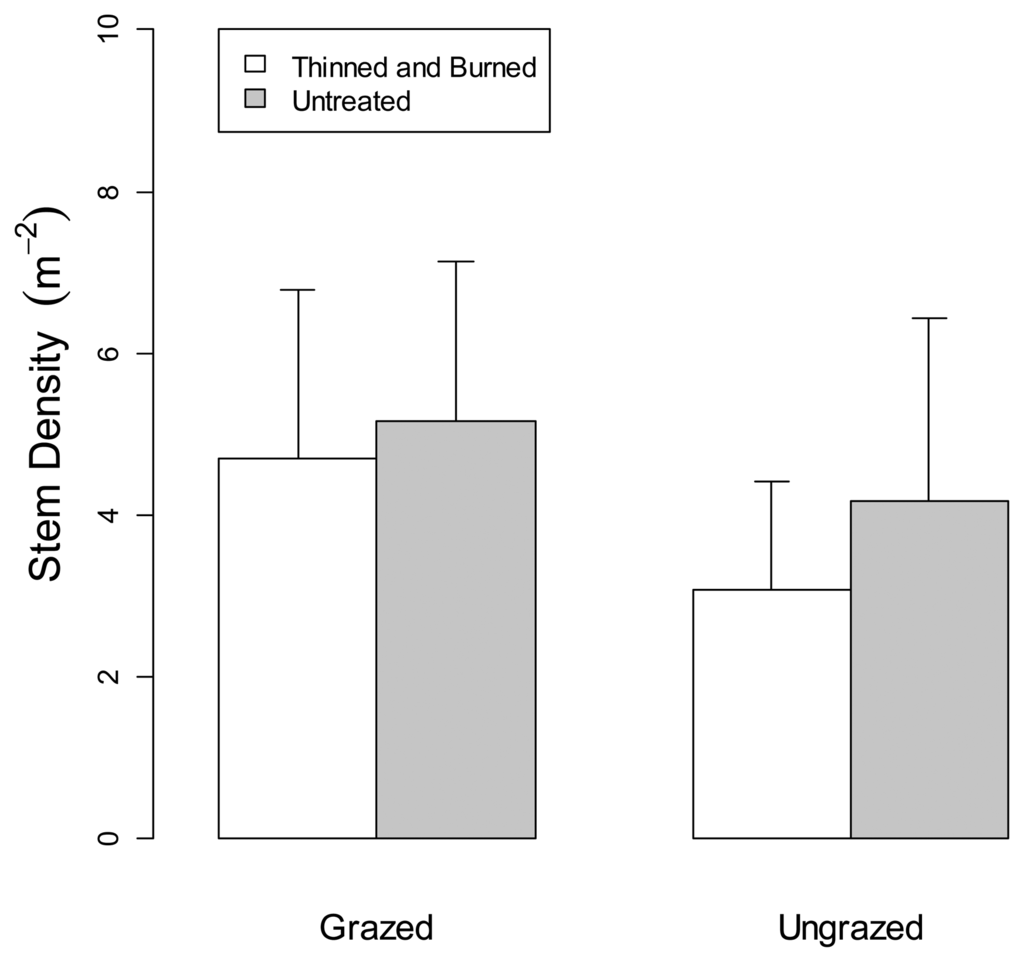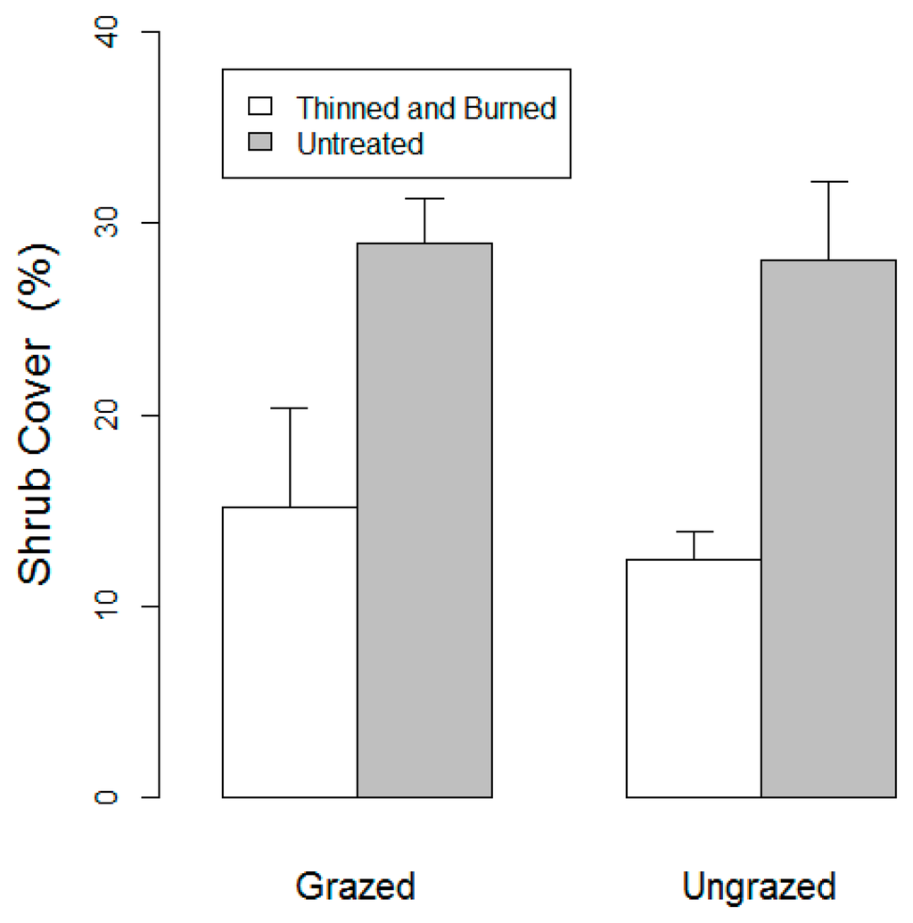 Figure 7 shows mean values of shrub stem density calculated from the U.S. Forest Service field collected data. Two-factor split-plot ANOVAs (Tables not shown) indicated that stem density did not differ between forest treatments (p = 0.78), grazed and ungrazed treatments (p = 0.17), or the forest treatment × grazing interaction (p = 0.71). Figure 8 shows mean values of shrub cover calculated from the U.S. Forest Service field collected data. Shrub cover differed significantly between forest treatments (p = 0.01) but not between grazing treatments (p = 0.68) or the forest treatment × grazing interaction (p = 0.83).