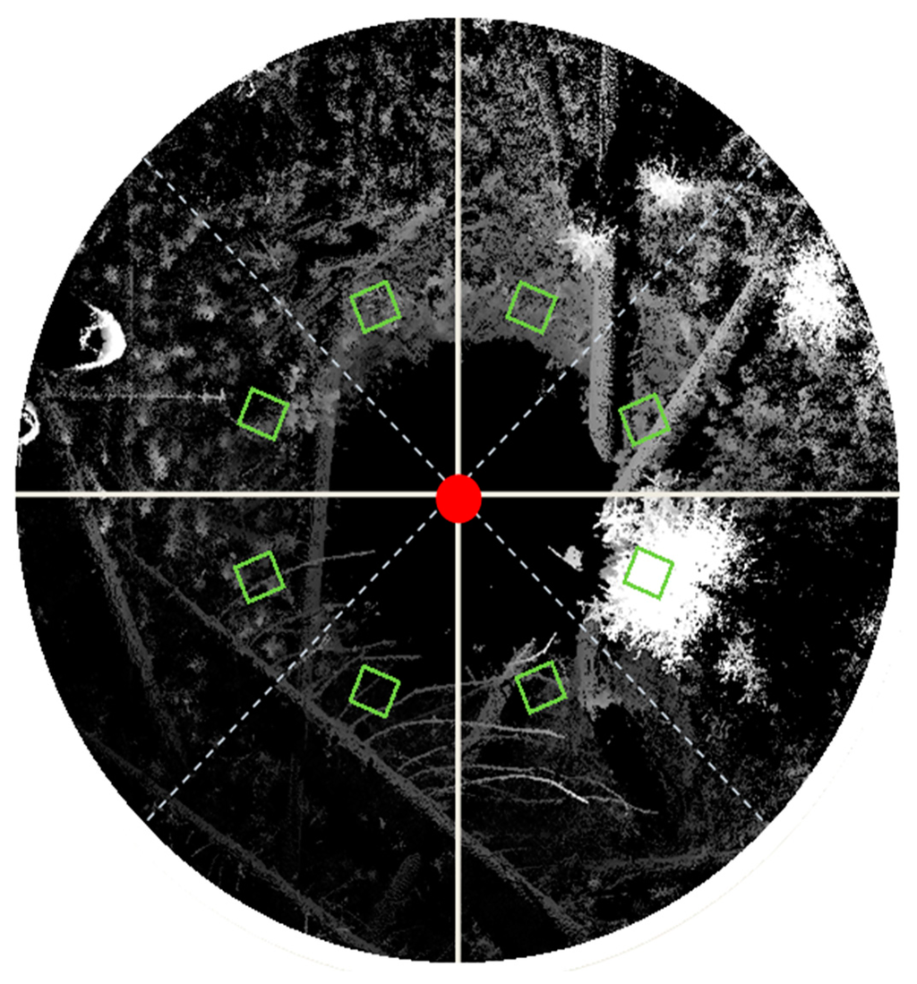 - Liang, X.L.; Litkey, P.; Hyyppa, J.; Kaartinen, H.; Vastaranta, M.; Holopainen, M. Automatic stem mapping using single-scan terrestrial laser scanning. IEEE Trans. Geosci. Remote Sens. 2012, 50, 661–670. [Google Scholar]