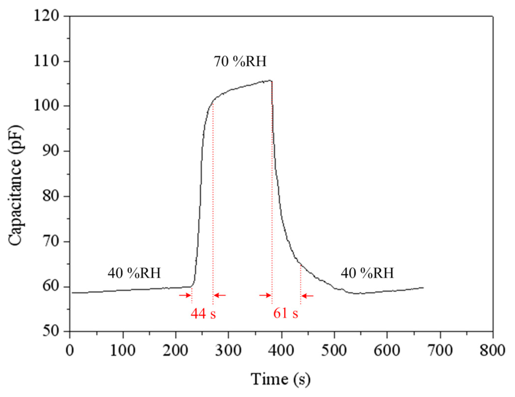 To understand the capacitance variation of the humidity sensor, the sensor without the ring oscillator circuit was tested under different humidity. The humidity sensor without the circuit was set in the test chamber. The test chamber provided different humidity to the sensor, and the LCR meter recorded the capacitance variation of the sensor. Figure 9 shows the capacitance variation of the humidity sensor at different temperatures. The measured results showed that the capacitance of the sensor was increased from 56 pF to 215 pF as the humidity changed from 40 to 90 %RH at 30 °C. When the temperature increased to 75 °C, the capacitance changed from 91 pF to 328 pF as the humidity varied from 40 to 90 %RH. Figure 10 shows the response and recovery characteristics of the humidity sensor at 30 °C. The results showed that the humidity sensor had a response time of 44 s and a recovery time of 61 s.