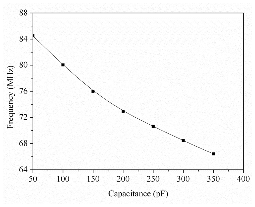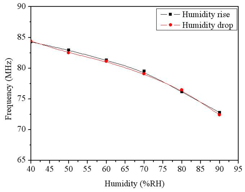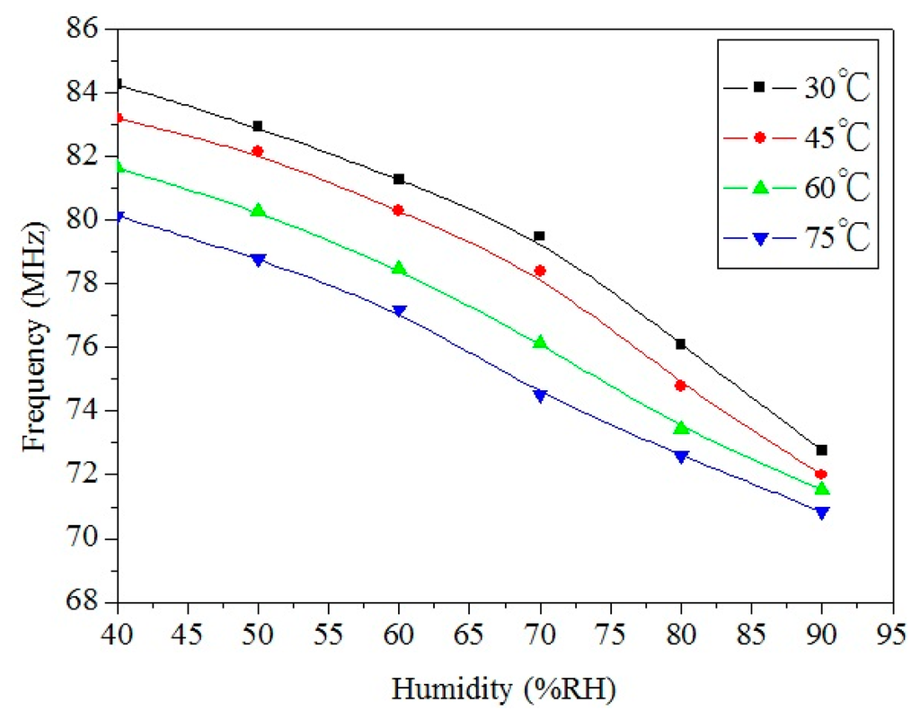 To characterize the influence of temperature, the integrated humidity sensor was tested under different temperatures. Figure 12 shows the measured output frequency of the humidity sensor at different temperatures. The results showed that the output frequency of the sensor decreased from 84.3 MHz at 30 °C to 80 MHz at 75 °C when the humidity was 40 %RH, and the output frequency also decreased from 73.4 MHz at 30 °C to 71 MHz at 75 °C as the humidity was 90 %RH. Thereby, when the temperature increased, the output frequency of the sensor reduced.