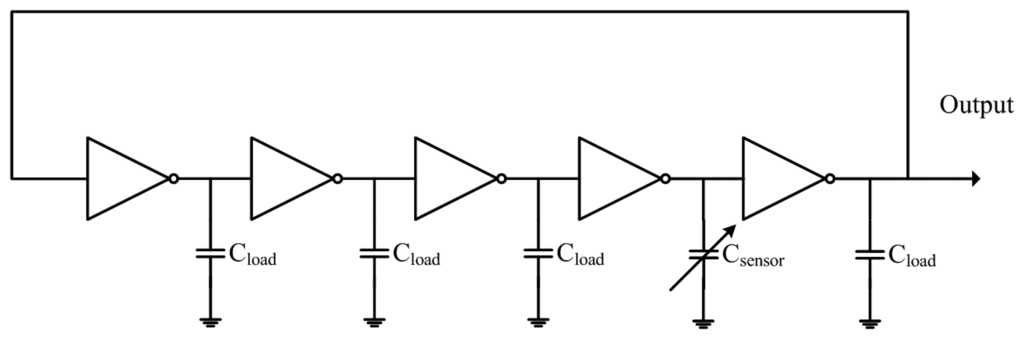 Figure 2 illustrates the five-stage ring oscillator circuit for the humidity sensor. The five-stage ring oscillator circuit converts the capacitance variation of the humidity sensor into the output frequency. The oscillation frequency fsensor of the ring oscillator circuit is given by Equation (1) [15,16]: