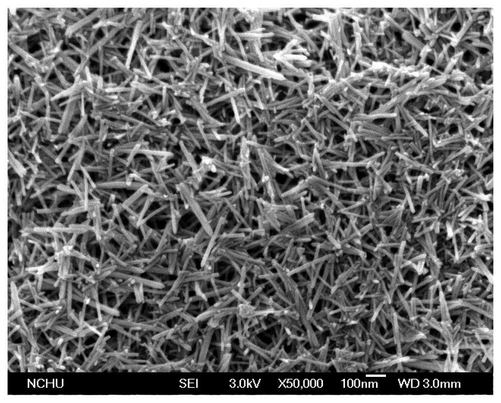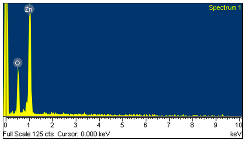 The surface morphology of the zinc oxide film was measured by scanning electron microscopy (SEM, JSM-6700F, JEOL, Tokyo, Japan). Figure 4 shows a SEM image of the zinc oxide film. The zinc oxide film is nanowire structures that can increase its sensitivity due to have a large surface area. The composition of the zinc oxide film was tested by the energy dispersive spectrometer (EDS). Figure 5 shows the EDS analysis of the zinc oxide. The main elements of the film are zinc and oxygen. The results depicted that the zinc oxide film consisted of zinc 75.97 wt% and oxygen 24.03 wt%.