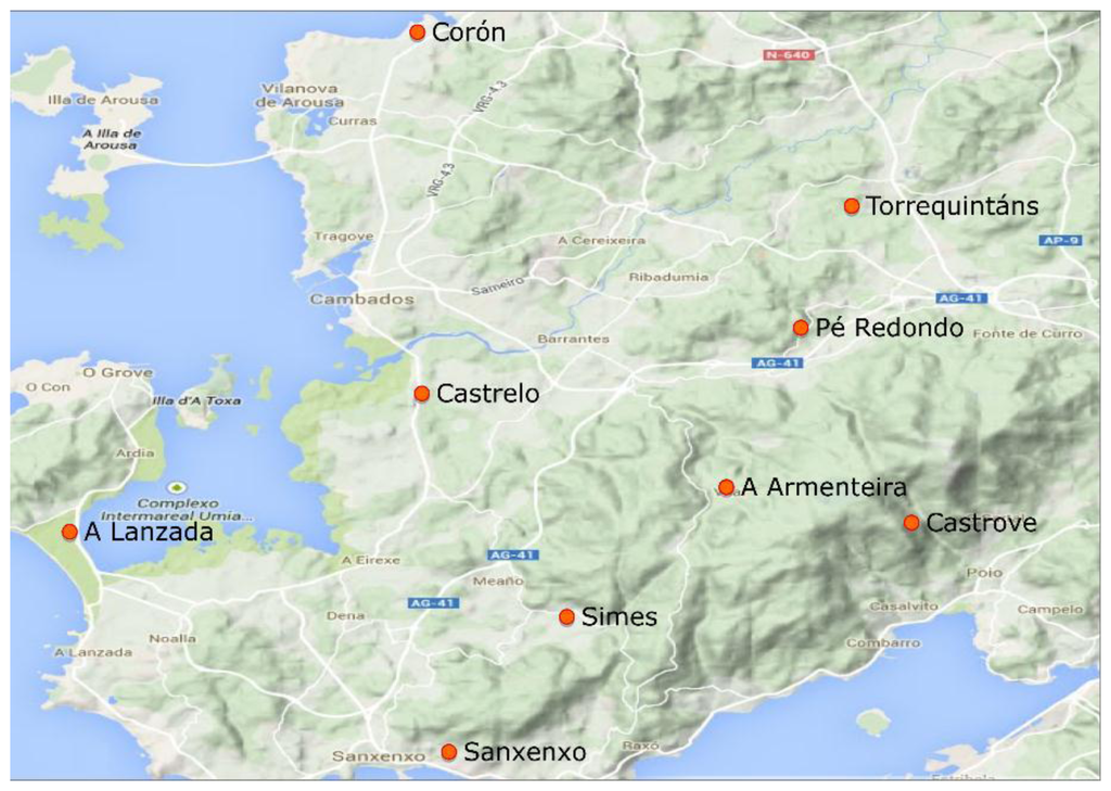 The study area extends over a small area located in northwest Spain (Figure 1), between 42°24′–42°34′ northern parallels and 8°42′–8°52′ western meridians, covering an area of approximately 254 km2. Bordered by the Atlantic Ocean to the West, and situated between two coastal bays, called “rias” (Ría de Villagarcía and Ría de Pontevedra), it has a temperate maritime climate and is one of the Galician areas that receives more solar radiation [36].