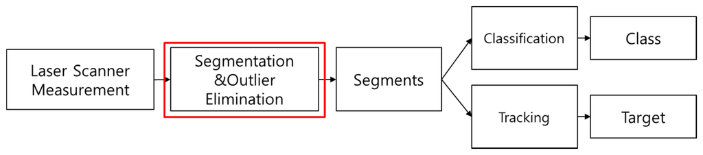 In the segmentation step, the proposed system receives a full scan (a set) of measurement points from a multi-layer laser scanner and decomposes the set into several segments, each of which corresponds to an object. In the segmentation step, the outliers are removed to avoid performance degradation. In the classification step, the segment features are computed and classified [12–14]. In the tracking step, the location and velocity of the segment are estimated over time. Segmentation is the essential step to execute classification or tracking [15–18]. In this paper, we focus on the methods for segmentation and outlier elimination.