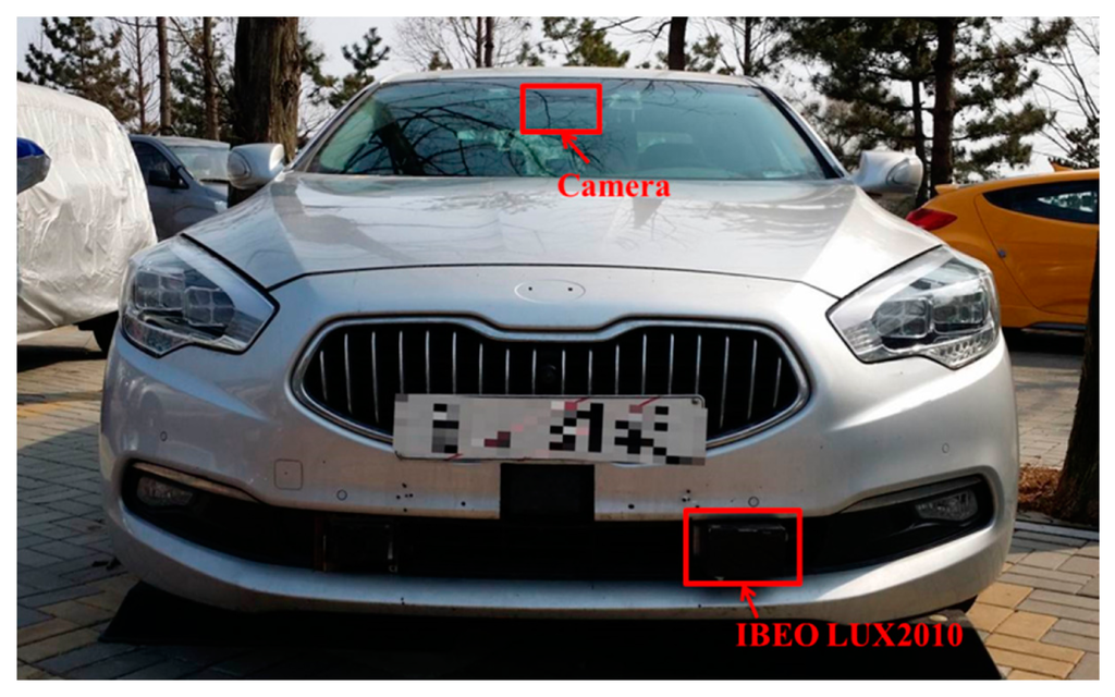 In this experiment, an IBEO LUX2010 multi-layer laser scanner and a camera are installed on a Kia K900 as shown in Figure 10. As previously stated, the LUX2010 has a total of four layers, and its horizontal and vertical resolutions are 0.125° and 0.8°, respectively. The camera is used to obtain the ground truth of the environment.