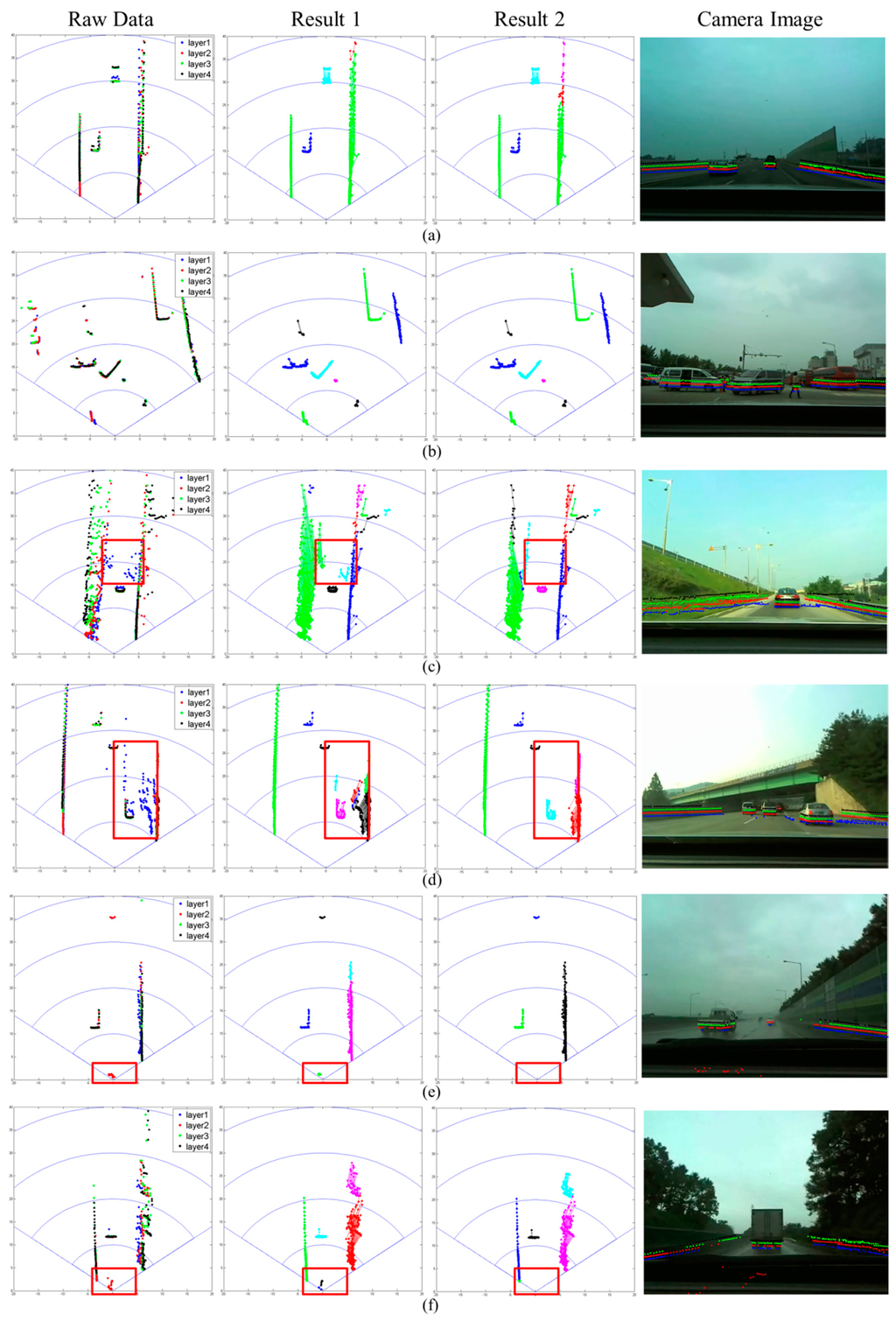 Figure 11c and d show the results when a ghost is detected that is created by the surface. In the figures, the dots in the red box are the ghost, detected by the bottom layer laser, which is indicated in blue. When the ABD segmentation method is applied (second column), the ghost forms an outlier segment and appears to be an obstacle. When the robust segmentation method is applied (third column), however, the ghost is successfully removed, leaving only the segments from the preceding vehicles.