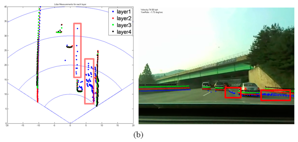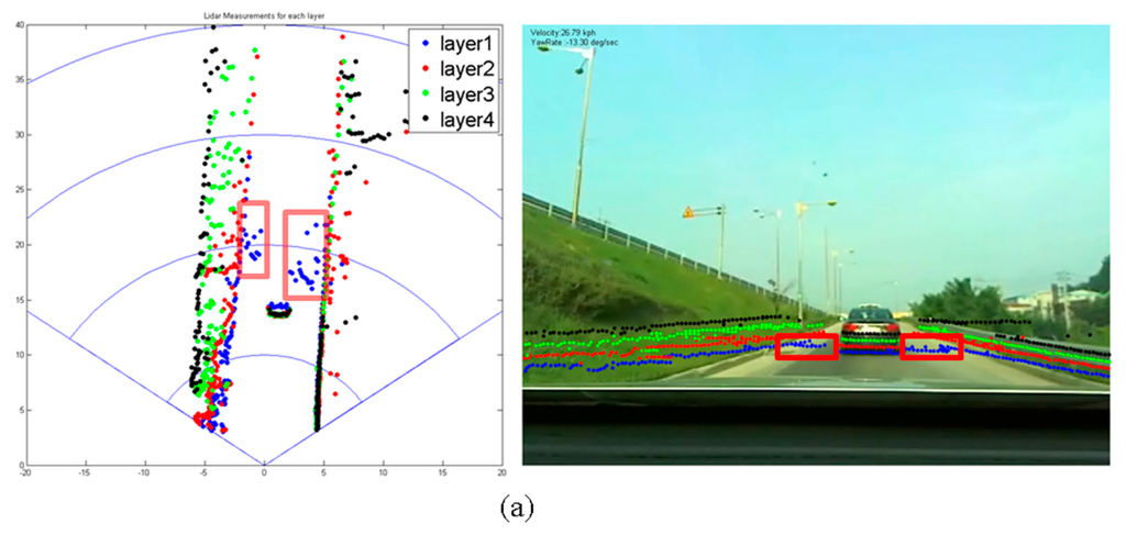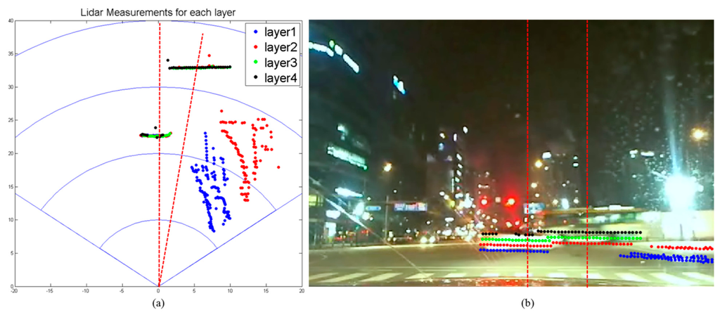 Figure 4a shows the laser scanner measurements depicted on the x-y plane, and Figure 4b shows the scanner measurements superimposed on the camera image after calibration [28]. In the figure, the information of the different layers is represented by different colors. In the multi-layer laser, each data point is not a pair but a triplet consisting of the distance and bearing to the obstacle and the layer information . The output of the multi-layer laser scanner is modeled by: