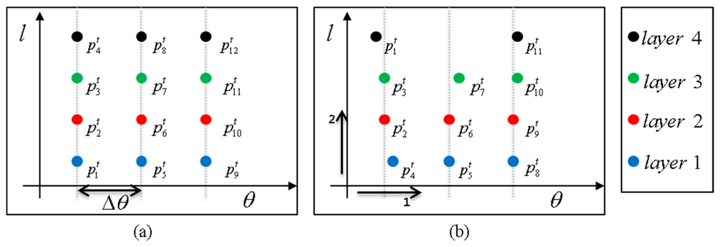 Figure 5. Scan points of the multi-layer laser scanner on the θ - l plane. (a) ideal output (b) actual output.
