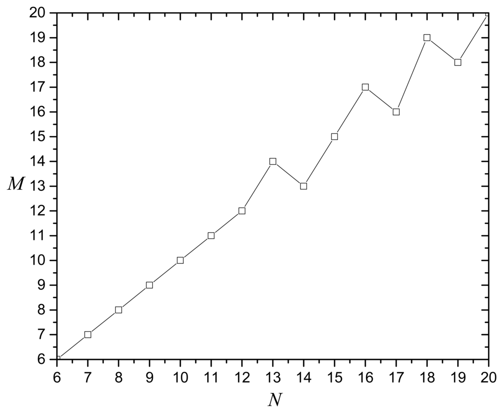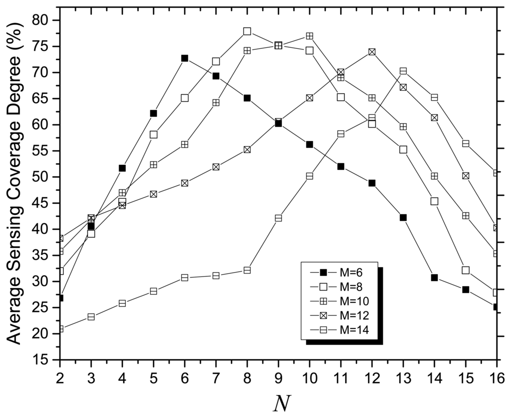 For MOCADMA, the M × N virtual cells dividing the target area at the initial stage bridge the problem space of WSNs and the solution space of chromosomes. In the simulation experiments, we consider 400 sensor nodes with no sensing error (re = 0) and 64 points of interest randomly and uniformly deployed in a 100 m × 100 m target area. Figure 1 shows the average sensing coverage degree (SCD) versus different dividing of virtual cells and indicates that the average SCD has the maximum value at N = 6 when M = 6, N = 8 when M = 8, N = 12 when M = 12, and N = 13 when M = 14. As Figure 2 shows, we can get the best dividing of virtual cells having maximum average SCD if M ≈ N.