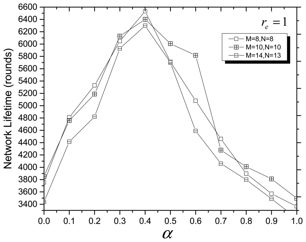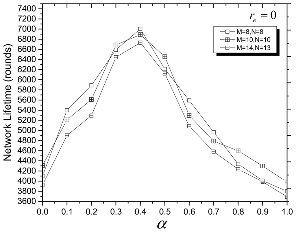 In the fitness function of MOCADMA, α and β (β = 1 − α) are the node utilization weighting coefficient and the energy balance weighting coefficient, respectively. In the next simulation experiments, we assume that N = 8, M = 8, or N = 10, M = 10, or N = 13, M = 14. Figures 3 and 4 depict the network lifetime (rounds) versus different values of α when re = 0 and re = 1, respectively, and we can see that the network has a maximum lifetime (rounds) when α ≈ 0.4 (β ≈ 0.6).
