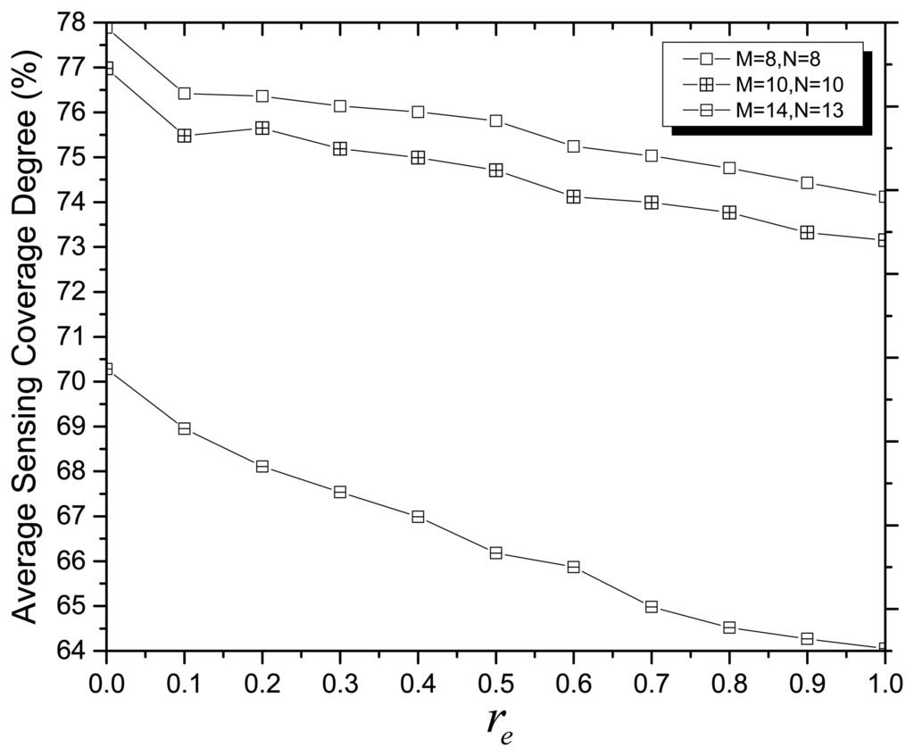 In a hostile environment, the sensing error often exists in the applications of WSNs, so we consider it (re) in computing the probability of sensing the point of interest by one sensor node eventually used in the fitness function of MOCADMA. Figure 5 shows the average SCD versus different values of re and indicates that the average SCD decreases with the increase of re. It is clearly seen that the more uncertainty from the sensing error causes more difficulties for network coverage.