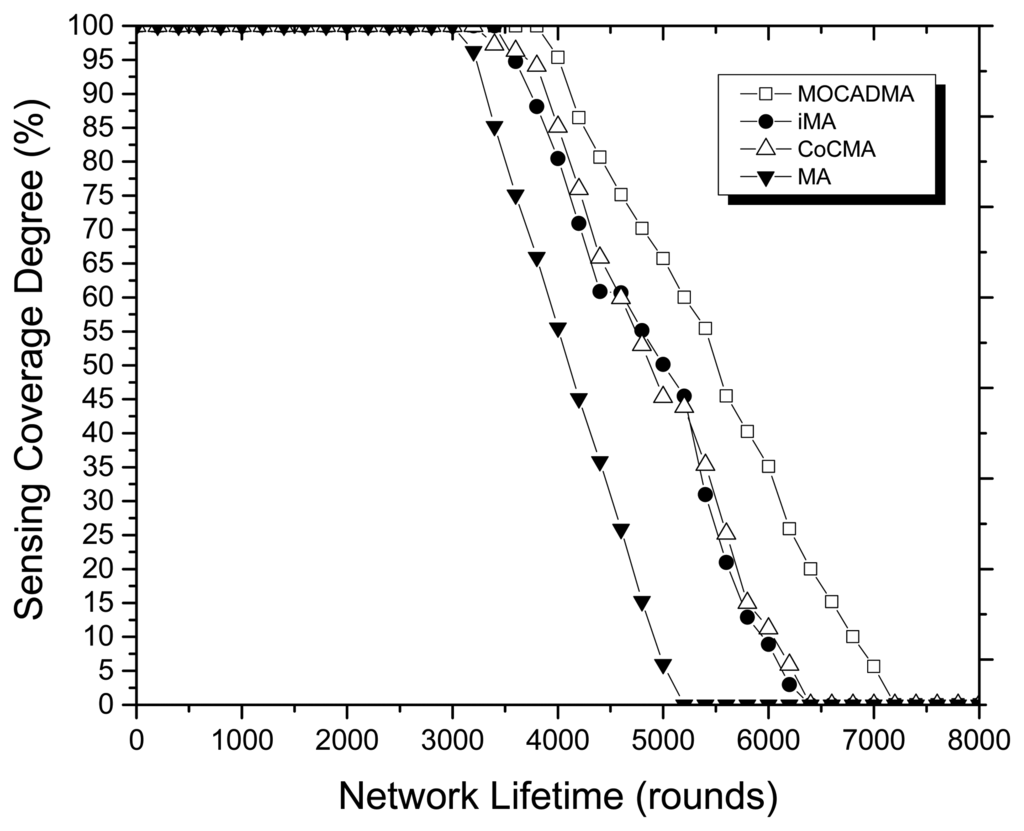 In the next simulations, we verify the feasibility of MOCADMA in WSNs and consider 400 sensor nodes and 64 points of interest randomly and uniformly deployed in the 100 m × 100 m target area. To evaluate the performance of the MOCADMA, an LEACH-based clustered routing protocol [26] is applied to the WSNs, and CoCMA [15], MA [18] and iMA [19] are re-implemented. In addition, the design of CoCMA, MA and iMA didn't allow the sensing error, so we only consider the WSNs with no sensing error (re = 0) in the simulation experiments. Figure 7 depicts the SCD versus network lifetime in rounds (α = 0.4 in MOCADMA). We note that all the algorithms have good capabilities in maintaining the sensing coverage, but MOCADMA has maintained the sensing coverage degree at 100% until the 3800th additional round which is a significant improvement over other algorithms. As Figure 7 shows, the network lifetime is prolonged to 7000 more rounds by the MOCADMA, which lasts about 800 rounds longer compared to CoCMA and iMA.