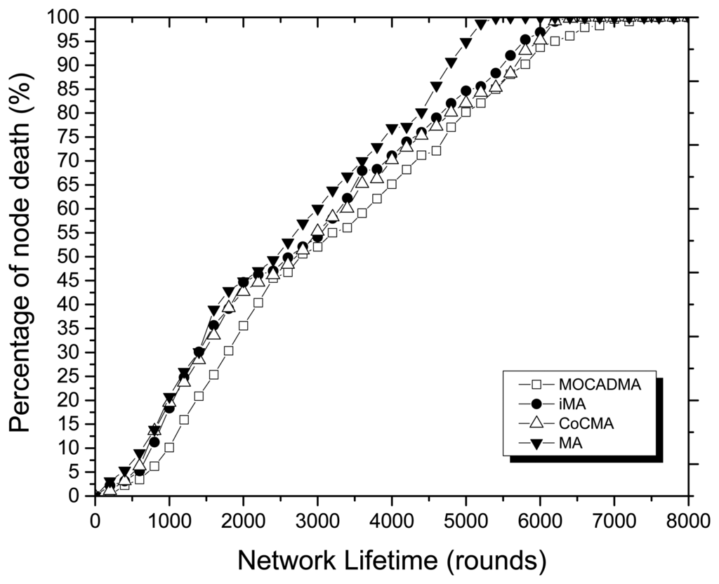 Figure 8 displays the percentage of node death versus network lifetime in rounds (α = 0.4 in MOCADMA). The MOCADMA, CoCMA, iMA, and MA lose their 50% of nodes at the 5516th, 5142nd, 4889th, and 4103rd round, respectively. The simulation result demonstrates that the proposed MOCADMA significantly prolongs the lifetime of the network compared to other three methods. The proposed MOCADMA divides the WSNs at the early stage and helps form the clusters earlier than other three methods that save much energy, get the multi-objective Pareto-optimal solutions of network coverage by the fitness function presented in Equation (17) that has a quick-convergence characteristic, so the longer network lifetime can be obtained. The simulation results show that MOCADMA can achieve higher network coverage while improving the energy efficiency and effectively prolonging the network lifetime.