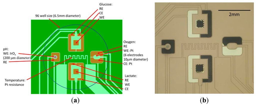 The testing of five sensors in parallel, either in potentiometric mode (pH) or amperometric mode (glucose, lactate) shows promise; in terms of outlook, the number of replicate wells and measurements could be scaled up for higher throughput analysis. Underlying this assumption would be the aim of further integrating the electronics with the cell culture plate(s) to enhance portability and robust operation. The MEMS sensor platform described herein could be interfaced directly with silicon-based signal conditioning electronics and components, such as miniaturised potentiostats, resulting in a truly integrated smart substrate. An integrated microwell platform comprising an array of electrochemical sensors and biosensors, based around additional enzymes for other analytes, would be valuable in monitoring cell metabolic activity for a variety of application areas, including toxicity testing of candidate drugs in the pharmaceutical industry.