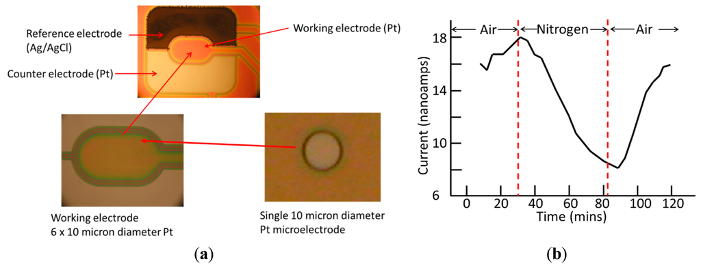 O2 sensors comprised 3-electrodes: a working Pt microelectrode array (six 10 μm diameter discs), an electroplated Ag/AgCl reference electrode (1500 × 400 μm), and a Pt counter electrode (1500 × 400 μm) (see Figure 4a).