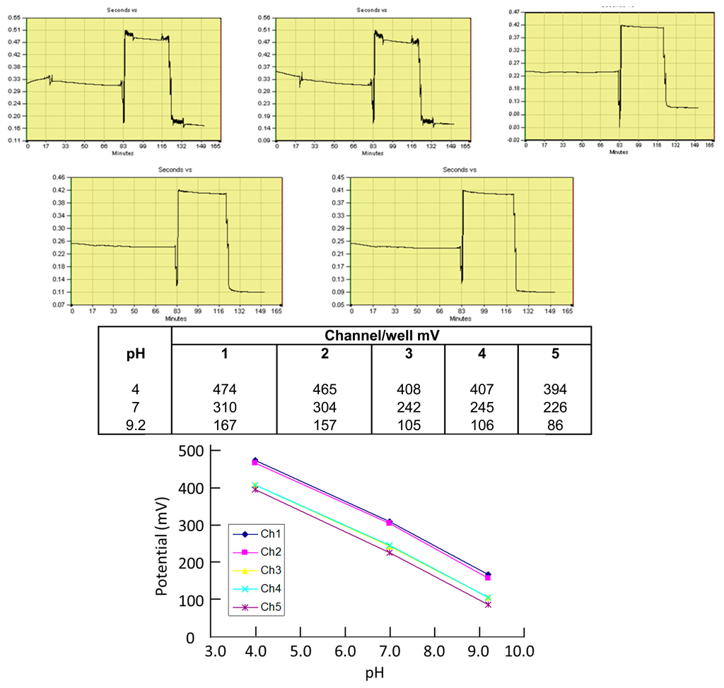 Figure 7 shows the results obtained for five pH sensors (one in each well) run in parallel in which pH 4.0, 7.0 and 9.2 buffer was introduced in turn. These runs were conducted in wells which had been coated with collagen to provide a surface that could encourage cell adhesion if required. There was an offset in voltage between wells, however the pH dependence of the potential was the same in each well, giving a slope of −54 mV/pH unit (CV = 1%). Drift on collagen-coated wells was 0.01 pH unit/hour. In operation, any differences in starting voltage between pH sensors would be normalized to allow direct comparison between different wells in real time.