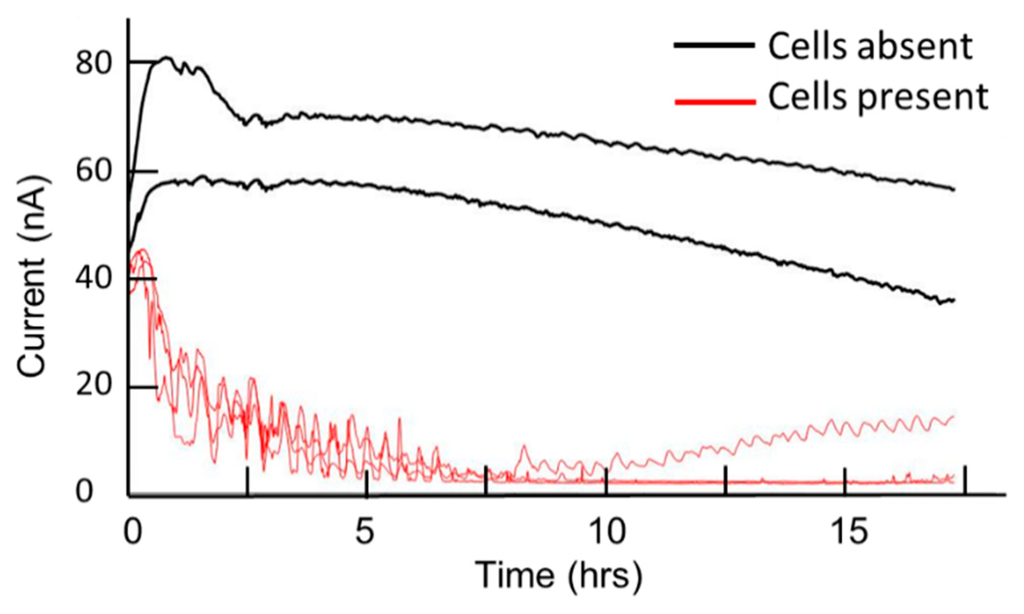 Five microwells containing glucose microbiosensors were run in parallel in amperometric mode (Eapp = +0.4 V). The wells were collagen-coated and contained culture medium with added glucose. Three of the wells contained 2 × 105 mammalian cells, while the remaining two control wells contained only culture medium. Figure 8 shows the responses obtained for the five microbiosensors. From a starting current response of around 70 nA for all five biosensors, those in the wells containing cells showed a rapid decrease in response over the first 2 h, which continued decreasing to baseline level by 8 h. In contrast, the two wells where cells were absent retained current responses of 50–70 nA at 15 h. These results are consistent with the known high glycolytic activity of the cells, which results in a rapid uptake of glucose from the culture medium, and its complete removal after 8 h in culture. This speed of glucose uptake compares with 9 h reported previously [12] for hepatocytes seeded at higher density (106/mL) and may reflect the known high metabolic rate of the BeWo cells used in the present study.