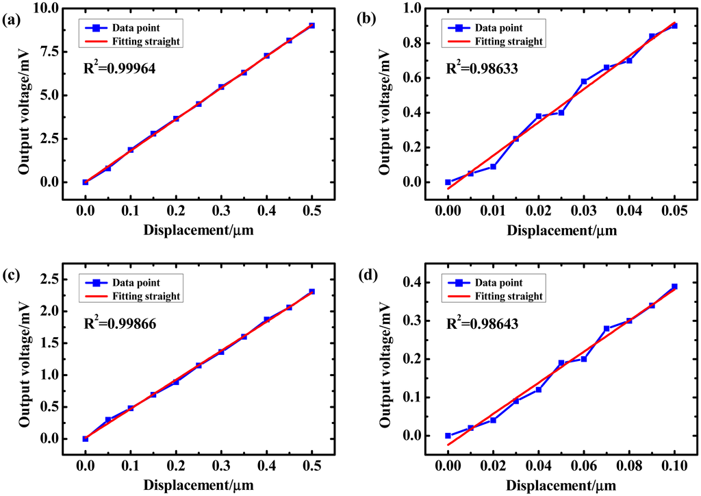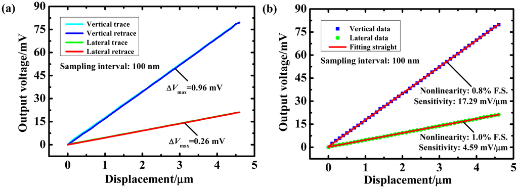 Resolution is an important parameter that directly determines the probing precision of a sensor. In the resolution test, the trigger point was set as the starting position. For determining the axial resolution, 50 and 5 nm steps were chosen. Figure 10b shows that the linearity of the straight fitting was 0.98633, which is an acceptable value. For an approaching step less than 5 nm, the linearity of the straight fitting decreased sharply, and data values of the forward and backward points could not be distinguished. Therefore, the axial resolution was regarded as 5 nm. Similarly, the lateral resolution was determined to be 10 nm. Cross-talk was not tested here; it may be mentioned here that cross-talk was observed to be very weak [].