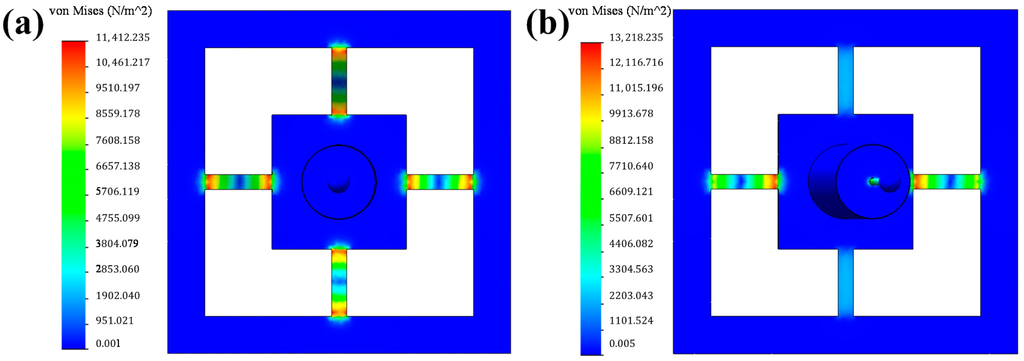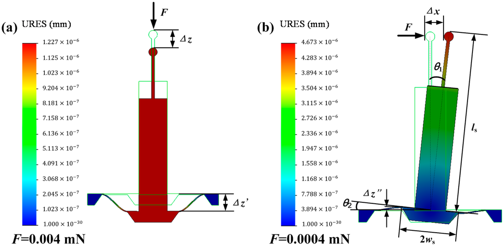 To realize optimal performance, stress simulation was conducted using a finite element method (FEM). Forces of 0.004 and 0.0004 mN were applied in the axial and lateral directions, respectively. The results can be observed in Figure 3. The design parameters of the sensing unit were determined using the FEM. The detailed analysis of the stiffness was similar to that performed in [].