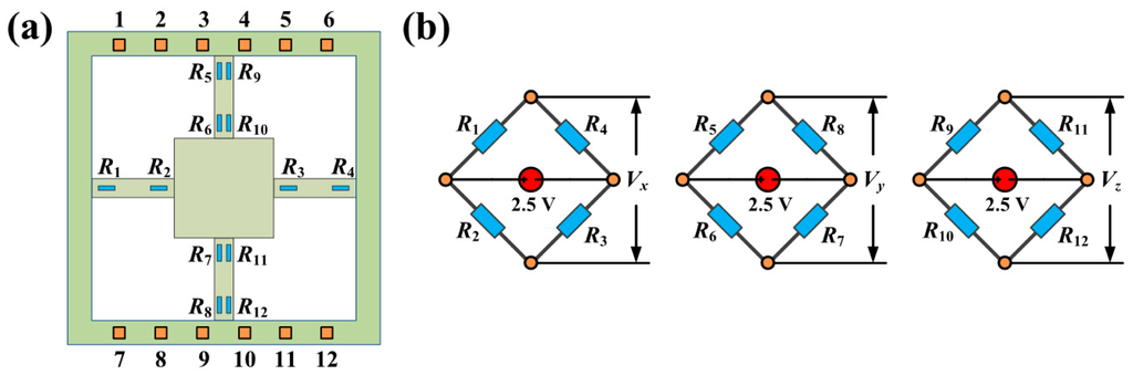 Variations in the stresses in the sensitive beam were detected by the three Wheatstone bridges, each of which consisted of four resistors. The resistors were easily affected by thermal drift. Therefore, the Wheatstone bridge was effective in improving the sensitivity. Figure 4 shows the distribution of the resistors and the connections of each resistor. The outputs of the axial and lateral loads were detected by different bridges. R1–R4 were part of the first Wheatstone bridge, which was used to detect the X-direction stress. R5–R8 were used for Y-direction stress detection, and R9–R12 were used for Z-direction stress detection.