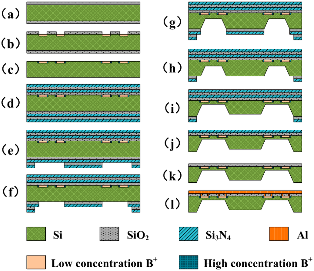 The sensing unit was fabricated using an MEMS bulk-silicon process, which is shown in Figure 6.