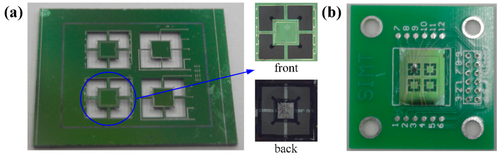 Figure 7a shows the manufactured sensing unit, which was fixed on a printed circuit board and connected to the data acquisition circuit through gold wires. The size of each unit was 4.6 mm × 4.6 mm. The assembled sensor is shown in Figure 7b. The value of the fabricated sheet resistor was approximately 5.83 kΩ.