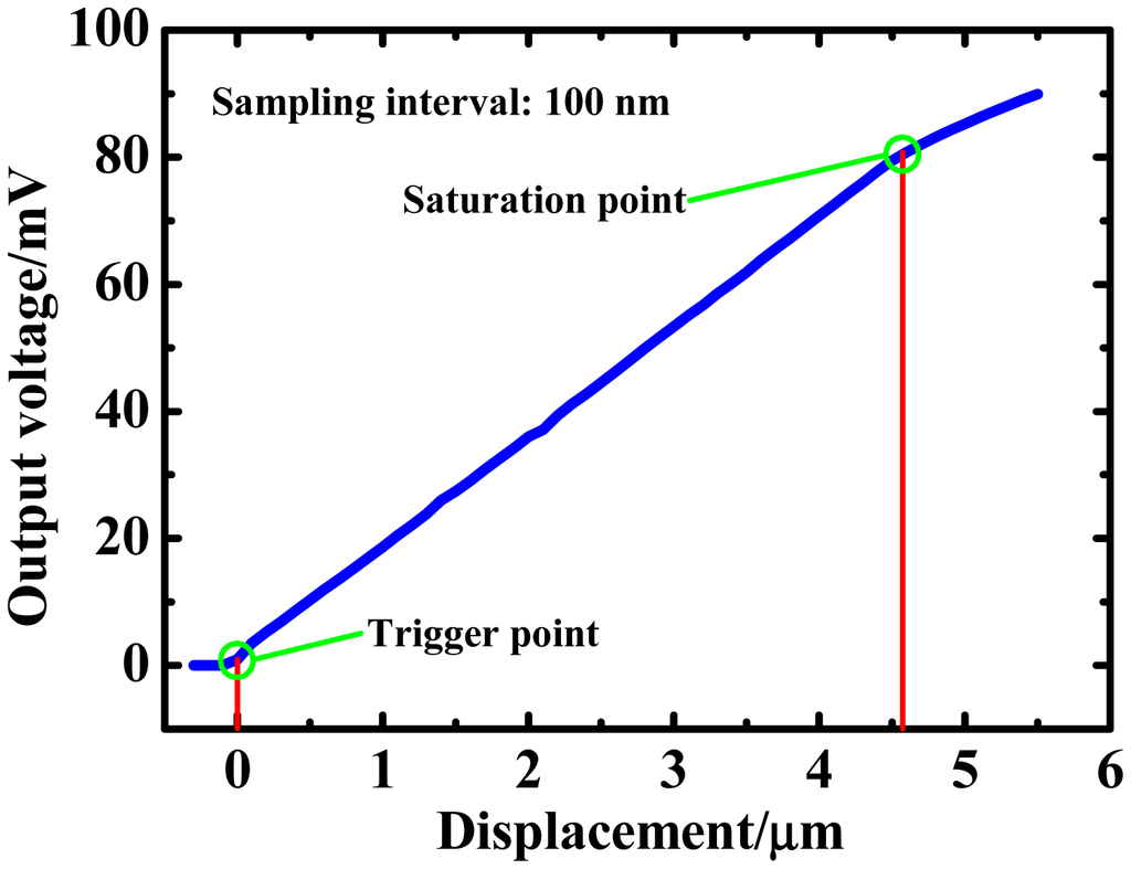 The sensor was calibrated using a nanometre positioning system, which has been described in []. The moving stage had a large coarse positioning range of 25 mm × 25 mm × 10 mm, a precise uniaxial positioning range of 12 μm, and an accuracy of 1 nm. A charge-coupled device camera was used as an auxiliary observation tool. The precise uniaxial positioning stage was calibrated by laser interferometer before experiment. The measurement error of the laser interferometer is within 0.7 × 10−6 L, where L is the measurement range. Figure 8 shows the result of axial range calibration. The sensor had an axial range of 4.6 μm. The saturation point indicates that the boss membrane was in touch with the backboard. The lateral range was not tested because of the risk of fracture. However, from (1), it can be deduced that the lateral range was larger than the axial range.