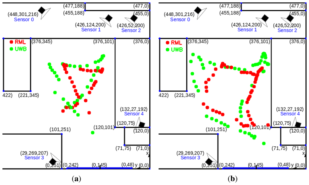 Moreover, the scatter plot in Figure 11b shows that the average speed per track (both Sequence 1 and 2) is well correlated and outliers are few. Most outliers are from short tracks with few position estimates. The average speed ῡ of a person in each sequence can be computed by dividing D with the sum of the duration T of all tracks in the sequence. Tracks of RML and UWB in Sequence 1 give ῡ of and while Sequence 2 gives and . From observing ῡ given by UWB ( ), it is clear that on average the person in Sequence 1 walks faster than the person in Sequence 2. The same conclusion can be reached from ῡ given by RML ( ).