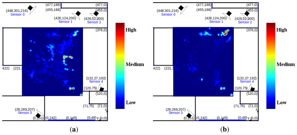 The speed error map, which is the difference between speed maps RML and UWB, is also shown in Figure 13a. Speed error is higher in areas underneath the cameras and at the door, compared with other areas in the room. High speed error implies poor camera coverage in those areas. Finally, the heat map showing the TATE of RML for each discretized cell in the room is presented in Figure 13b. The largest errors occur near the door and near Sensor 1 and 2, where camera coverage is minimum.