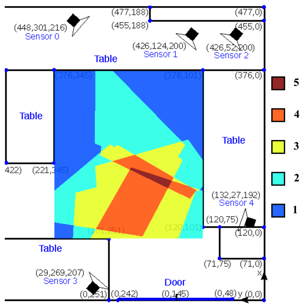 The results in this paper were obtained on an initial system setup in a relatively small room (5 × 5 m2) in our lab. Figure 2 shows a floor plan of the setup. This system consists of five stereo visual sensors. The placement of these sensors is non-ideal because of practical constraints. Figure 2 displays the visual sensor coverage of the room. Most of the possible walking area is covered by at least two sensors, except the upper left and upper right regions near the table, which are covered by only one sensor. The effect of camera coverage on the performance our tracker is discussed in Section 5. The main goal of this system was to test the hardware and tracking algorithms before installing a larger test system with 10 sensors in larger service flats, where it will be used to monitor the behavior of elderly people over many weeks. In fact the system has very recently been installed and will be operational soon.
