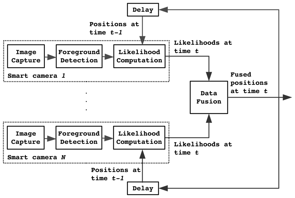 Next, each sensor analyzes the likelihood that a person is in specific position in the room, given the current foreground image and knowledge of the location of persons in the preceding frame. The fusion center then fuses these likelihoods and estimates the most likely new position of the person. Finally, the jointly estimated position is fed back to all sensors, which will use this information when processing the next frame.