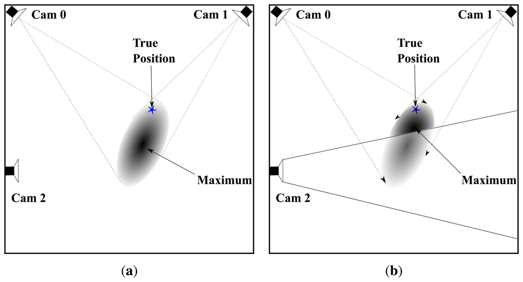 All sensors (5 stereo visual sensors for our setup) are included in the calculation of ll(s) even when s is not in their FOV. Despite the non-visibility of a person in the FOV of a particular camera ĉ, including likelihood llĉ in the calculation of ll results in a more accurate joint estimate. Figure 5 demonstrates this with a toy example with three cameras. Suppose a person is at the location marked by a blue star, which is in the FOV of camera 0 and 1 but not in the FOV of camera 2. Figure 5a shows the joint likelihood computed from the observed foreground image of camera 0 and 1. However, the position of the likelihood peak is a bit far from the true position (probably due to noise/error in foreground detection). When camera 2 is included in the joint likelihood computation, it contributes a term to the likelihood, which reduces the overall likelihood within its FOV since it does not observe any foreground pixels. This shifts the likelihood peak position closer to the true position of a person.