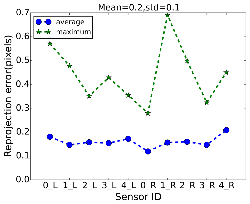 The intrinsic parameters for all visual sensors used for capturing the aforementioned multi-camera sequences are obtained using the calibration method proposed by Zhang [26]. The extrinsic parameters were estimated by the method proposed by Guan et al. [27], which uses a sphere as a calibration object. The calibration accuracy, i.e., reprojection error, of all visual sensors are shown in Figure 6. The reprojection errors were computed on a number of spheres positioned in the room. They are defined as the mean square-root distance between the observed pixel coordinates of the spheres and the pixel coordinates computed by projecting the known world coordinates of the sphere centers into the images.