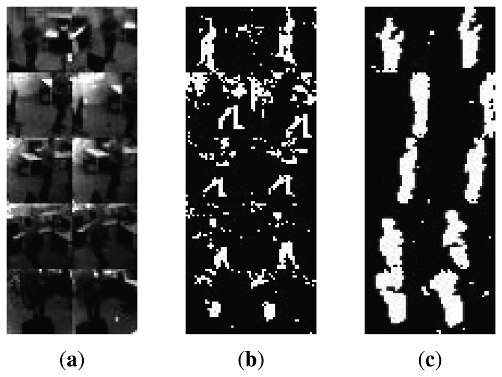 For our dataset, most of the existing methods already have problems in the initial stages of video processing, i.e., the robust segmentation of foreground objects (people) from the scene background, due to the aforementioned intensity fluctuation problem. Specifically, methods like [22,23] react poorly or too slowly to lighting changes. Figure 7b,c shows the foreground/background segmentation results of optimally tuned ViBe [23] and our method based on correlation. Visual inspection clearly shows that the ViBe method fails to detect approximately 40% of the person's body with noticeably high number of false detections in the background. However, our correlation-based method is able to detect almost 100% of the person's body with relatively lower number of false detections.