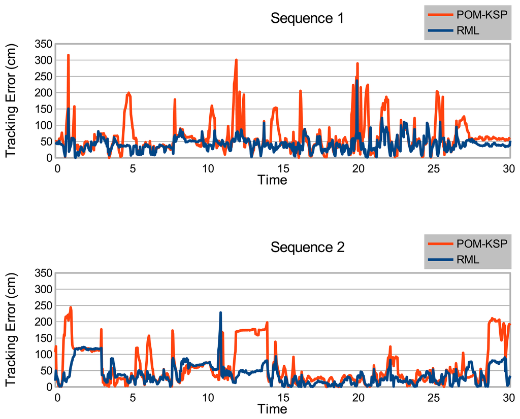Table 1 shows the result of the experiment. The TATE values of our proposed RML tracker are compared with those of Berclaz et al.'s POM-KSP tracker. In our current track, the random walk model only imposes some weak constraints on the temporal continuity of the tracks. While this property is essential to avoid tracking loss, it is not ideal regarding the track accuracy. For this reason, Table 1 includes not only results for the “raw” tracker output, but also results after applying simple forms of sliding window post-processing: temporal median and temporal mean filtering. In both cases the sliding window size was 5.