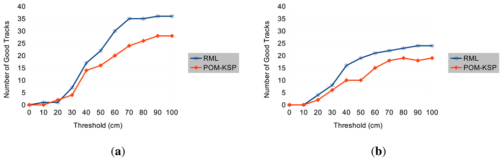 Table 1 shows that the RML tracker produces 2 to 3 times fewer bad tracks depending on the dataset. Figure 9 shows how the number of good tracks varies with the selected threshold. Interestingly at very rigorous thresholds (when most tracks are rejected), POM-KSP performs slightly better than RML. However, at this threshold most tracks are invalid in both methods. This can be attributed to the very low resolution of the cameras and the associated limitations in image processing and calibration. Figure 10 shows some example of good tracks obtained by RML and UWB. The comparison in Figure 10 indicates that the shape of tracks, i.e., walking pattern of a person, produced by RML and UWB are very similar despite small deviation in their location estimates.