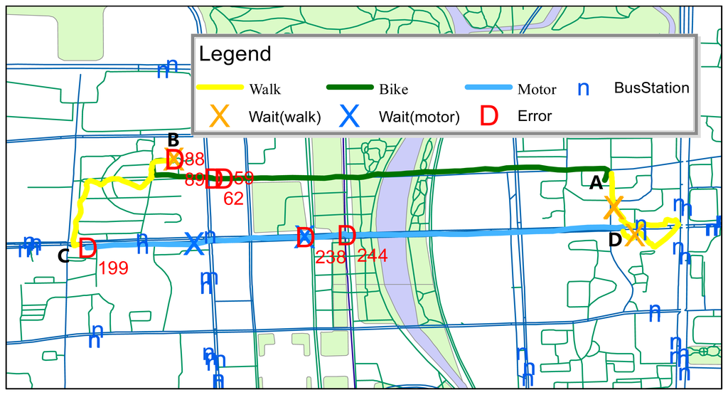 Our demonstration was the classification of a travel loop involving multiple modes of transportation. The travel loop is illustrated in Figure 10. A was the starting point. A subject left A on a bicycle and arrived at B. After parking the bicycle, the subject walked through a crossroads to reach C. The subject then boarded a bus at a station near C and rode it to D, where s/he walked through a crossroads and returned to starting point A. The wait mode sections while walking between A and B were produced by parking the bicycle. The wait mode sections while motoring between C and D were incurred by the bus waiting for traffic lights and stopping at stations. The wait mode sections while walking between sections D and A were produced by waiting for traffic lights and making another short pause.