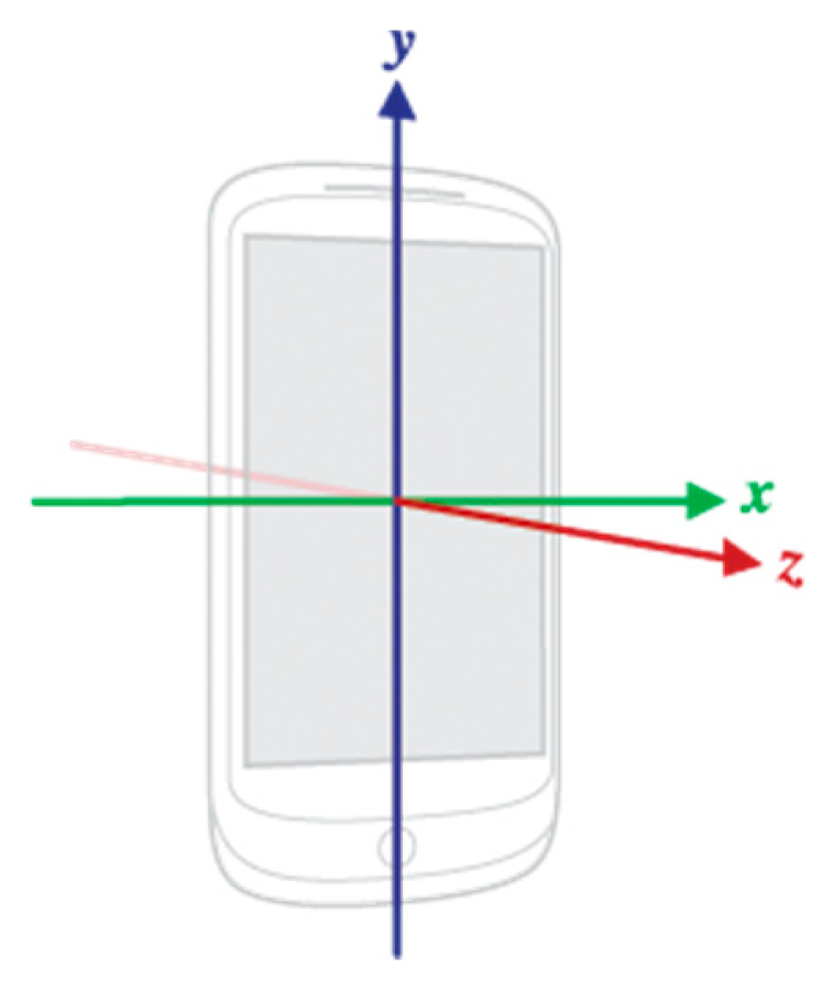 As previously mentioned, in several related studies [14–19], the accelerometer is used to obtain vibration/oscillation features of users’ bodies or their transportation mode. Although [12] uses both an AS and GS to analyze user driving habits, the primary GS function is rotation feature extraction. Moreover, not every type of mobile device is equipped with a GS. Thus, we limit our motion sensing capacity to what is independently provided by the accelerometer. As shown in Figure 2 (Internet image [27]), the device assumes a standard three-axis coordinate system to express data values.