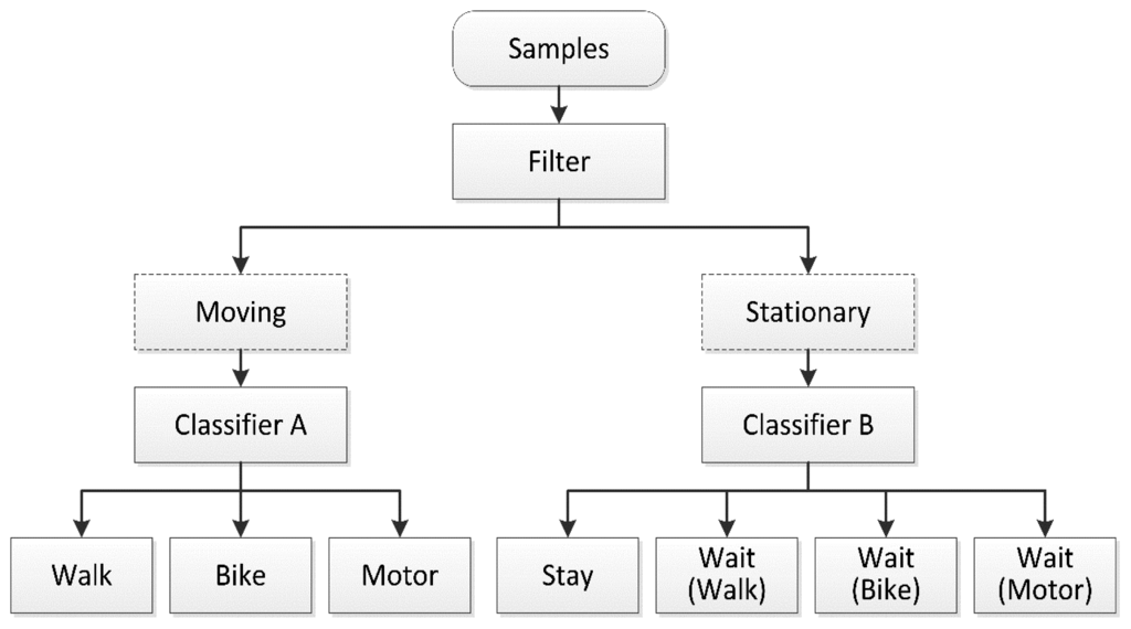 Methods for transportation mode classification and human motion recognition from a variety of perspectives have already been proposed. In [10,11], for example, the authors propose approaches to inferring people's transportation mode based on GPS tracking and knowledge of the underlying transportation network. In [12], accelerometers and gyroscopes are used to analyze driving habits. In [10,13], a combination of GPS and Geographic Information System (GIS) is proposed for identification of transportation modes. The methods presented in [14–19] extract acceleration information within the frequency range of the human gait and thereby implement gait pattern classification. Similarly, in [20], the author extracts gyroscopic data features to classify leg motions. Although instructive, most of these studies focus on highly specific application fields (e.g., medical care) and/or are too dependent on high-precision sensors to enable achievement of more broadly defined aim. While a few studies have proposed techniques for classifying common transportation modes, the classification models used by these methods are not sufficiently refined or robust for wide use. Finally, unlike some of the above studies, we wish to avoid use of a GIS spatial database because it would involve infeasible restrictions.