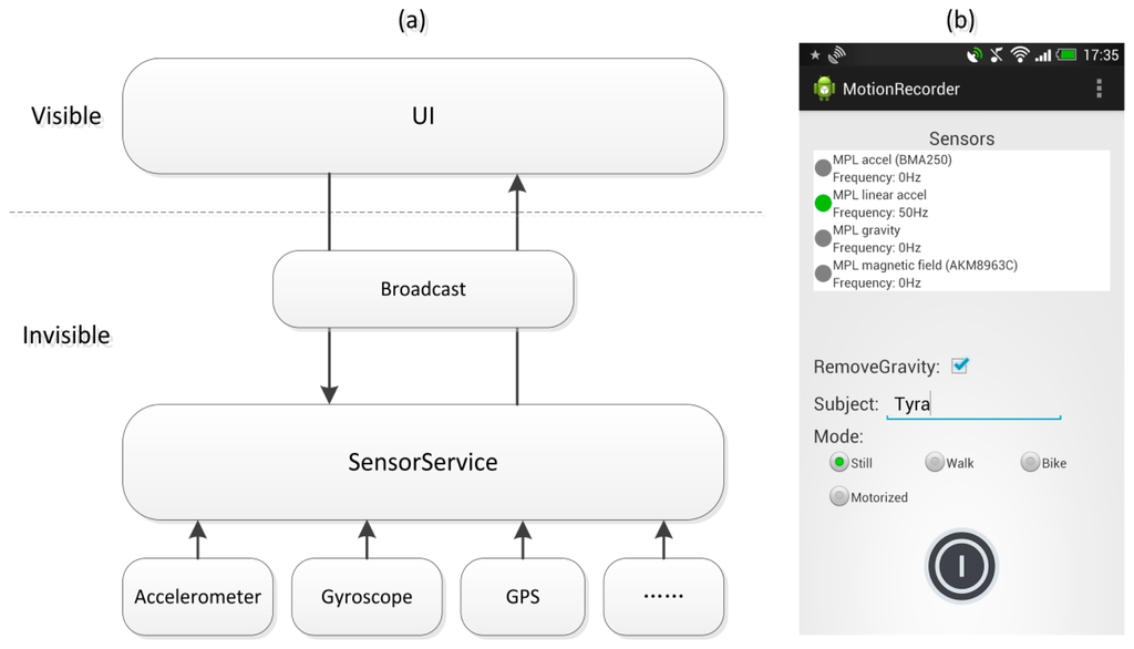 Our application is comprised of a sensor service and user interface. The sensor service is an independent process that collects data from location and motion sensors and stores it in the Secure Data (SD) card of the smart phone. The sensor service is controlled through the user interface, which communicates with the sensor service through the Broadcast of Android system. This reduces the impact of the user interface on the data collection process and prevents the user interface thread from being blocked by the high-frequency sensor data collection of the sensor service.