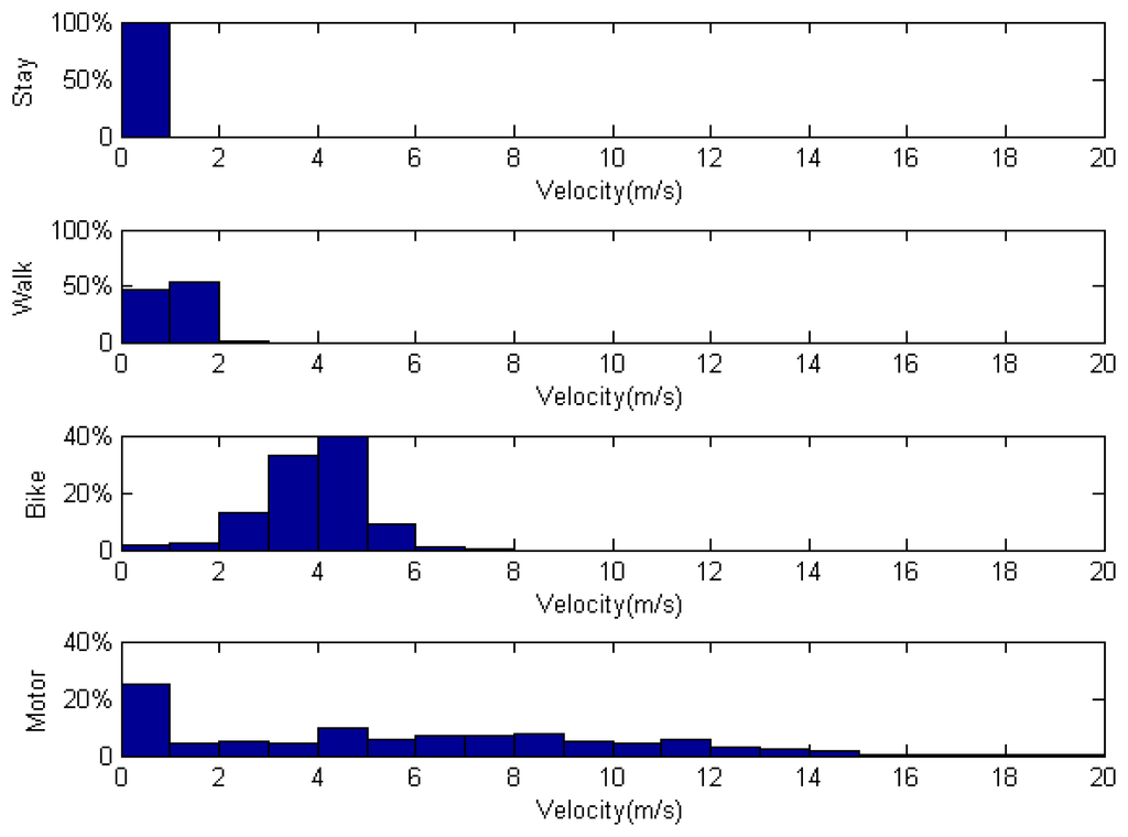 As shown in Figure 6, the percentage of participant records with a velocity near 0 when traveling in a motor vehicle was greater than 20%. To reflect the general situation of daily vehicular commuters, data collection was performed in urban areas of Beijing, where traffic is tightly managed by traffic signals and there are often gridlocks during rush hour.