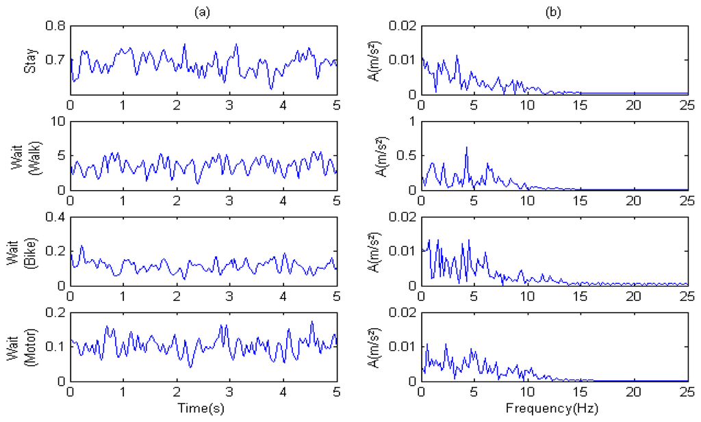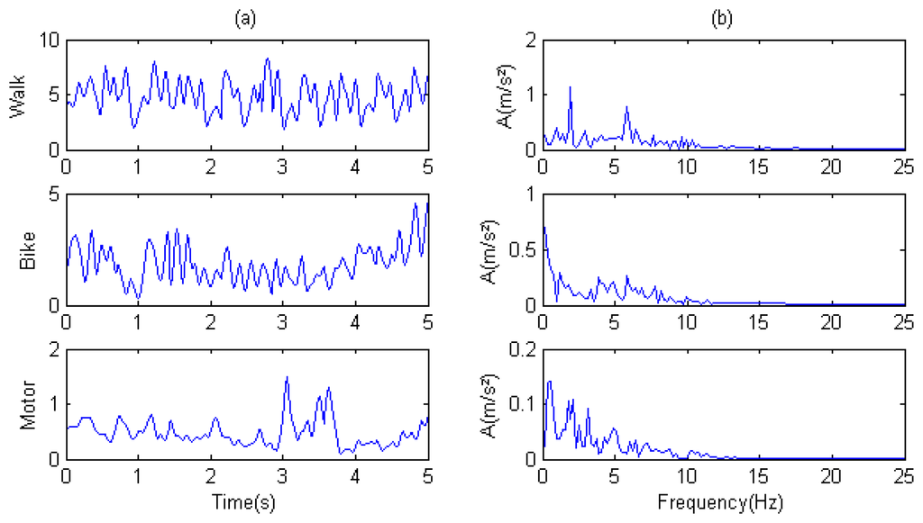 As mentioned in Section 2.1, in transportation mode classification, the vibration characteristics from acceleration signal and velocity data will be used. We attempt to analyze the vibration characteristics from frequency domain and time domain. Discrete Fast Fourier Transform (DFFT) is the most important discrete transform, used to perform Fourier analysis in many practical applications [31]. We select DFFT features to represent frequency-domain characteristics of acceleration. First proposed by Richman [32,33], Sample Entropy (SampEn) is used extensively for assessing the periodicity of a physiological time-series signal and shows good traits such as data length independence and trouble-free implementation. A SampEn feature is used to reflect the periodicity of acceleration. We use statistical features of velocity.