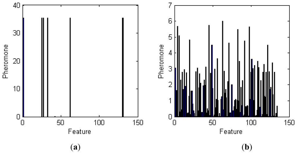 To understand the importance of each feature in the classification process, we used the method described in Section 3.6 to analyze the pheromone trail of those features. The results of this analysis are given in Figure 9.