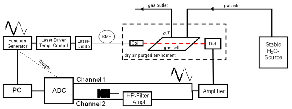 - Buchholz, B.; Ebert, V. Offsets in fiber-coupled diode laser hygrometers caused by parasitic absorption effects and their prevention. Meas. Sci. Technol. 2014, 25. [Google Scholar] [CrossRef]