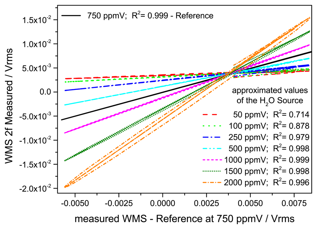 Figure 10 shows the fits gained by the linear regression procedure against a reference spectrum at 750 ppmV and their residuals. For concentrations smaller than the reference the slope is smaller and for higher concentrations bigger than unity. The extracted slope of this linear regression is then calibrated against the absolute concentration derived from the quasi simultaneous dTDLAS measurement. With increasing H2O concentration the slope wings are shifting further apart due to the increased self-broadening of the absorption line. This results in a larger deviation for the linear fit, but this does not affect the derived slope with the H2O concentration. For further improvement of this regression procedure more reference spectra at different concentration levels could be used.